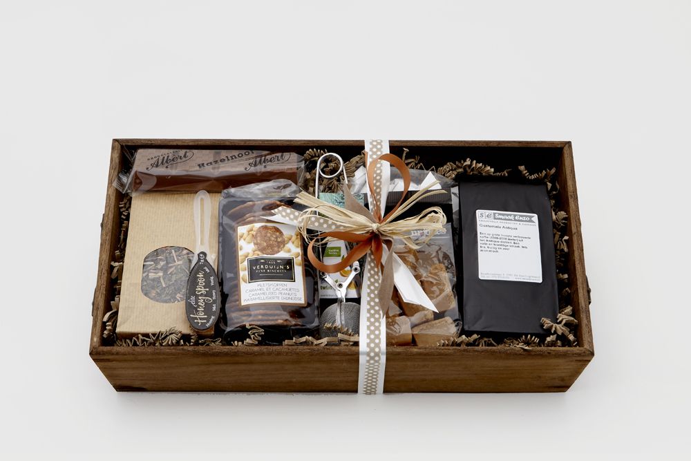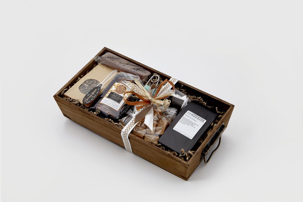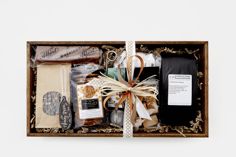 Een mooie houten kist vol met lekkere, ambachtelijke producten. Voor ieder wat wils! Zowel koffie, thee als genoeg lekkernijen voor vele, heerlijke genietmomenten. Het cadeaupakket wordt verpakt in transparante folie.