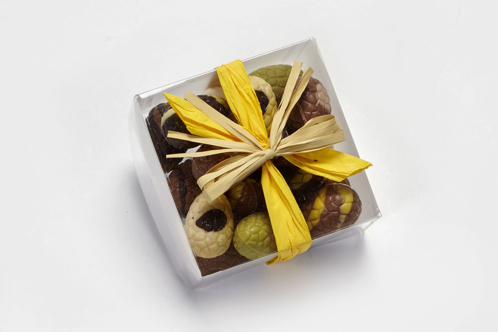 Dit doorzichtige bakje bevat 250 gram heerlijke Paaseitjes van onze chocolaterie.