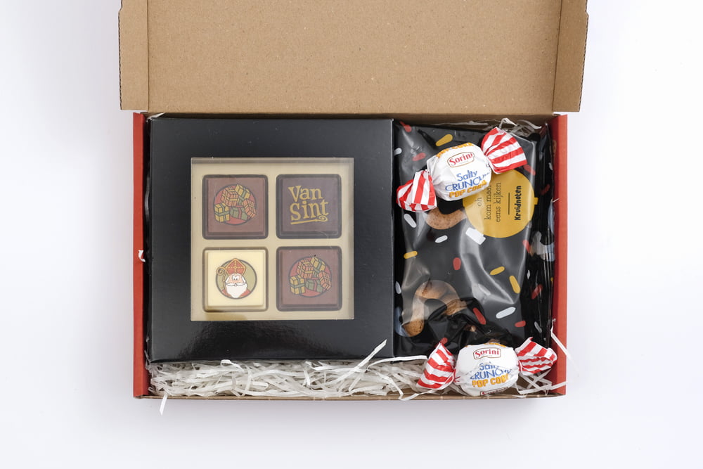 Dit gezellige brievenbusdoosje is gevuld met allerlei lekkernijen die passen bij een gezellig avondje. In de box zitten heerlijke pralines, pepernootjes en chocobollen. Een leuke attentie voor je medewerkers of relaties!